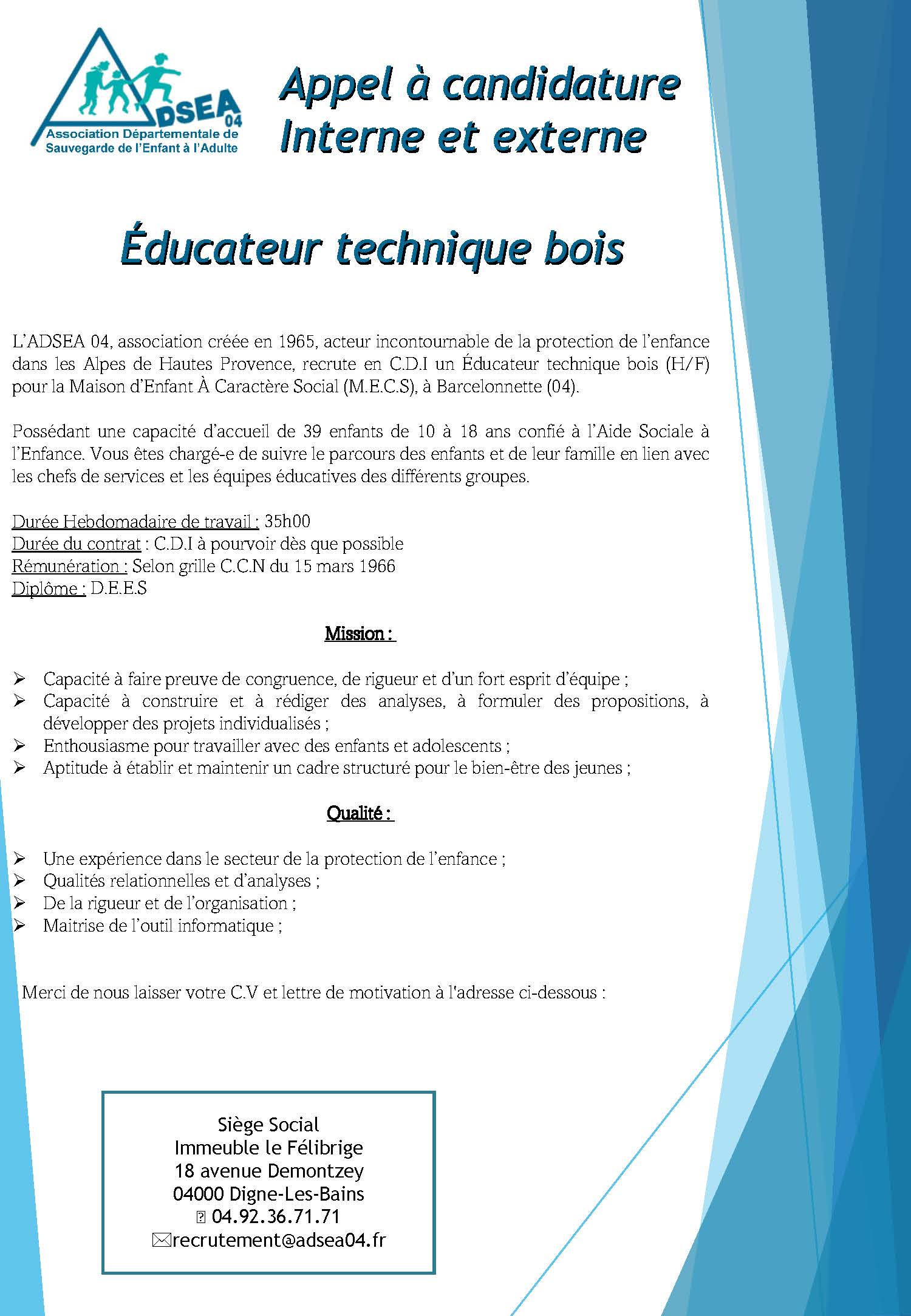 Appel à candidature Educateur technique bois à la MECS de Barcelonnette Caroline souteyrand2024-02-26T12:49:50+02:00